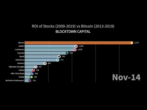 between Bitcoin BTC and the best performing stocks of the last decade.